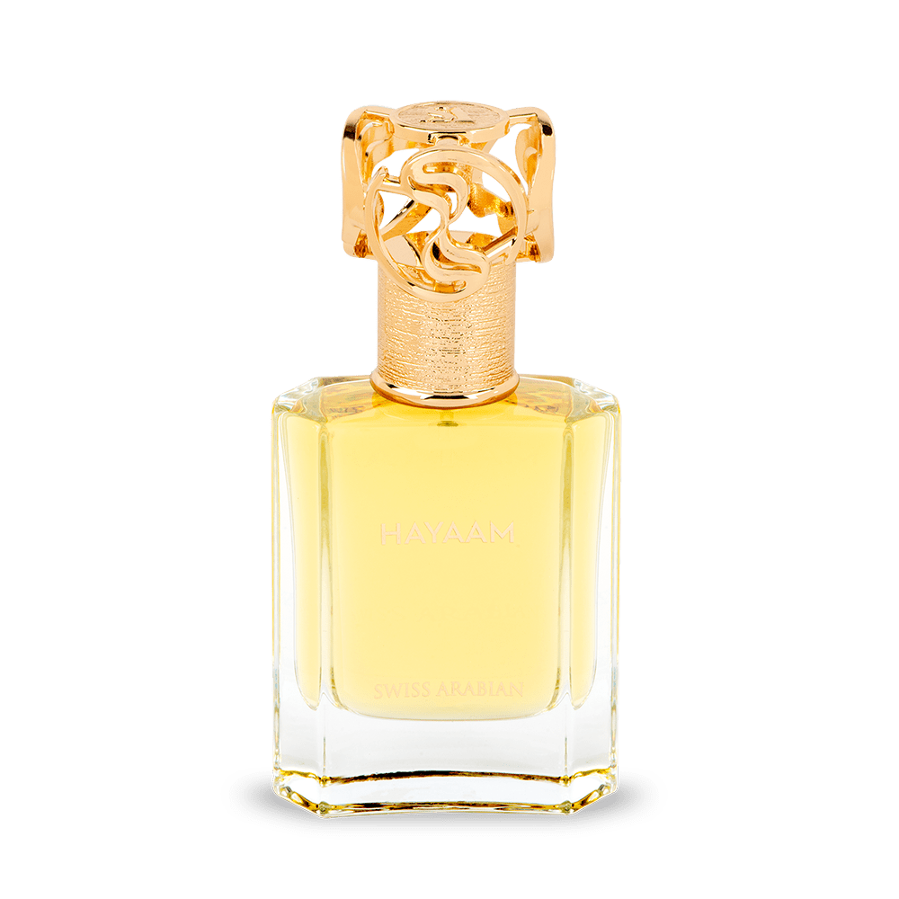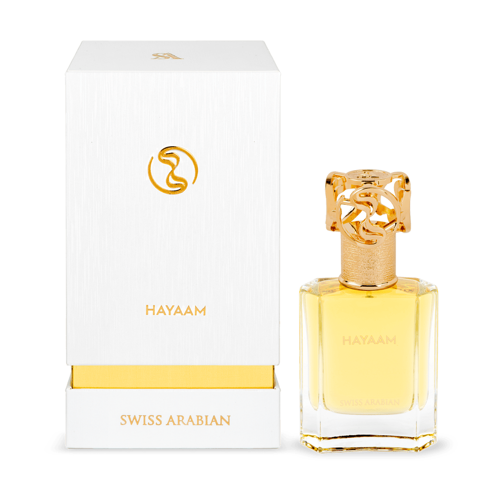 Hayaam means adoration. The perfume inside, with its dazzling citrus notes, has been created to make you impossible to resist. It is a woody, leathery fragrance inspired by love that makes you lose yourself. Infatuation embraces your every thought and your eyes dazzle with brilliance at every glance you share. You are powerless to resist. Dazzling citrus notes make your soul dance to the tune of your heartbeat and the radiance of your scent fills the room. The heat of clove from a faraway land adds an exotic spice to your soul as the fervor of your passion dances in your eyes. As your scent surrounds you with the ancient woods of the past and the smooth leather notes of the present, you know that you are lost in this love forever. The warm amber embraces you in its golden aura and whispers that this is the bliss you have been seeking. Lost in love.